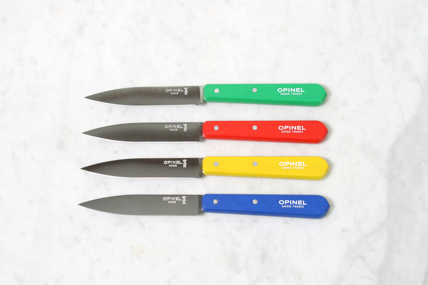 A set of four paring knives with the distinctive and graceful Opinel blade and handle shape, still made in the Savoie, France.