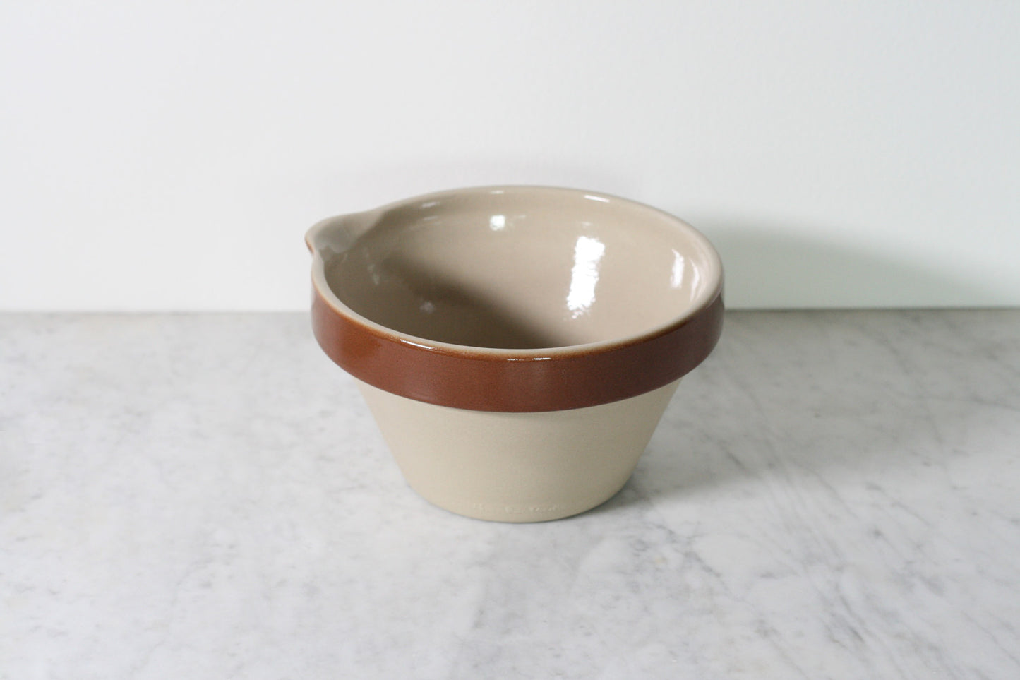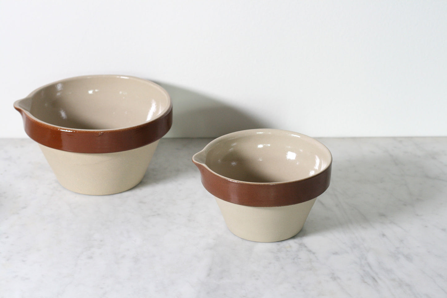 Three sturdy stoneware mixing bowls complete with convenient pouring spouts and easy-to-handle unglazed exteriors. Each size is sold separately.