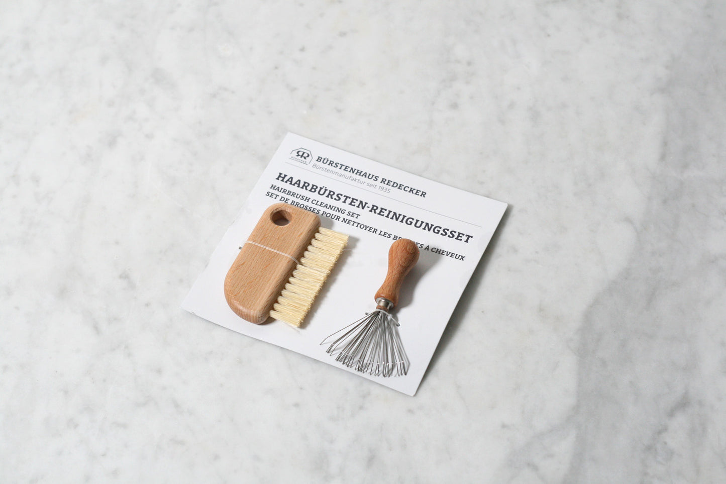 A set of tools to keep your hair brush in tip-top shape from Burstenhaus Redecker, one of the last producers of handcrafted brushes in Germany. Use the metal comb to remove hair; moisten the small light bristle brush to clean residue from the bristles.