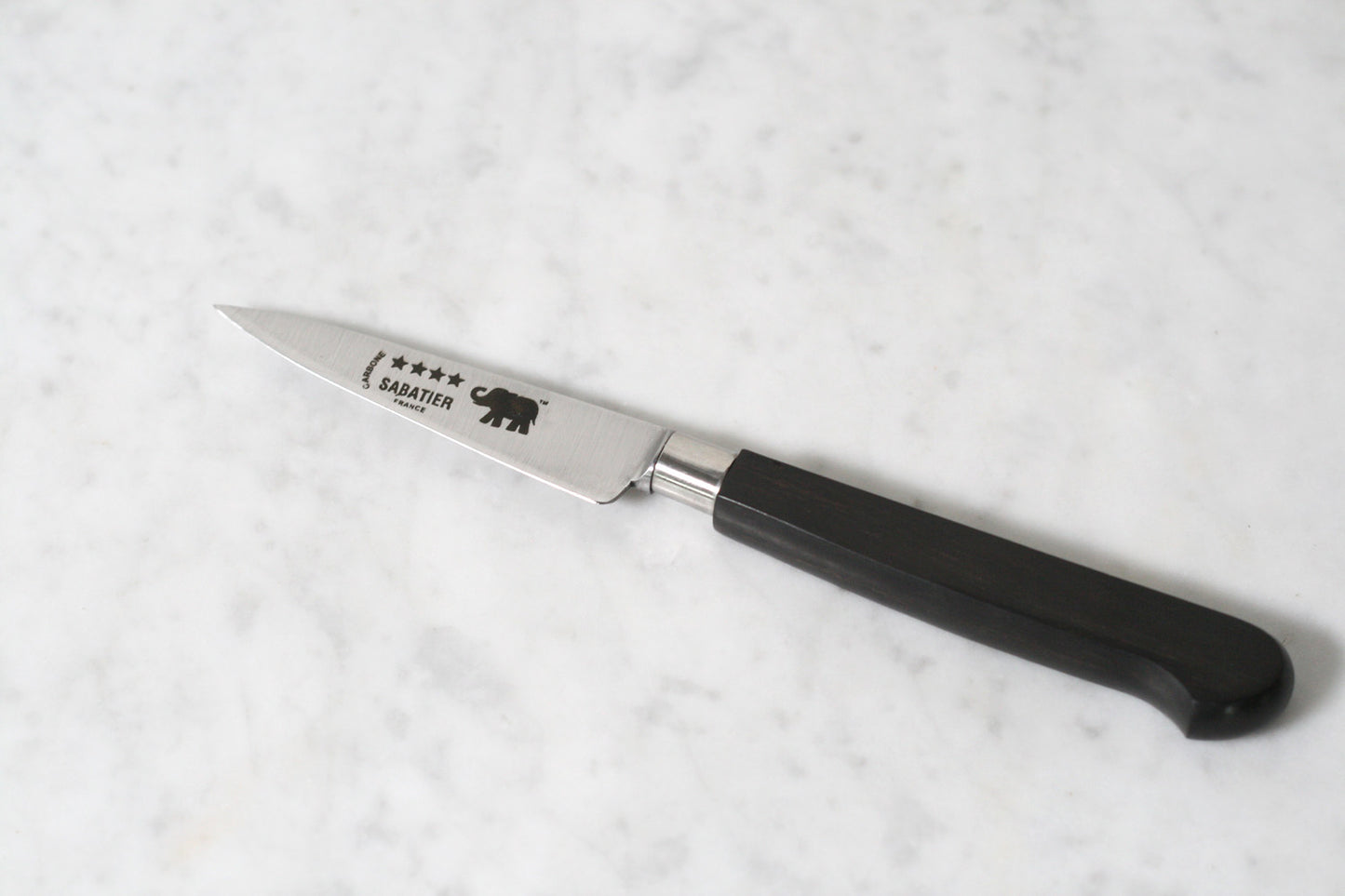 The carbon steel blade is fully forged and sturdy, yet lightweight. Ebony handle.