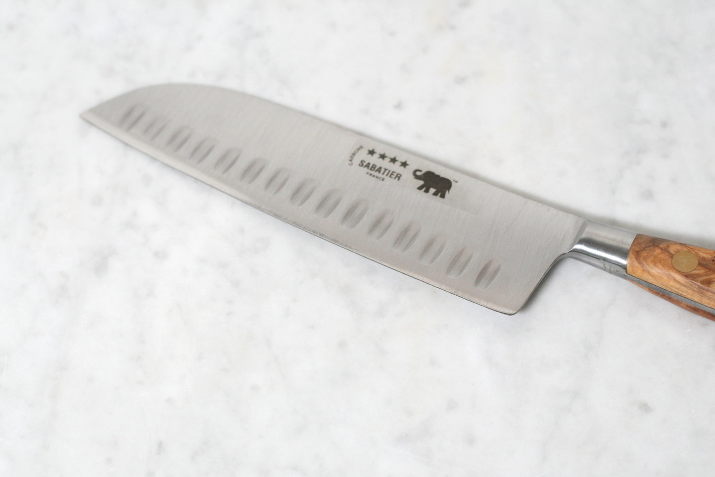 A Santoku knife crafted in Thiers, the historic center of French blade making, by our favorite cutlery company, Thiers Issard.The Sabatier name originated in Thiers at the beginning of the 19th century, and signifies fully forged construction and high quality craftsmanship. Though the Sabatier name can now be found on a wide range of knives, this knife is a true example of Sabatier quality.