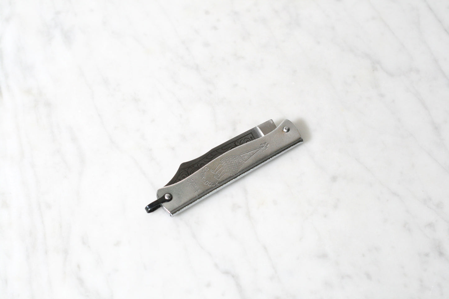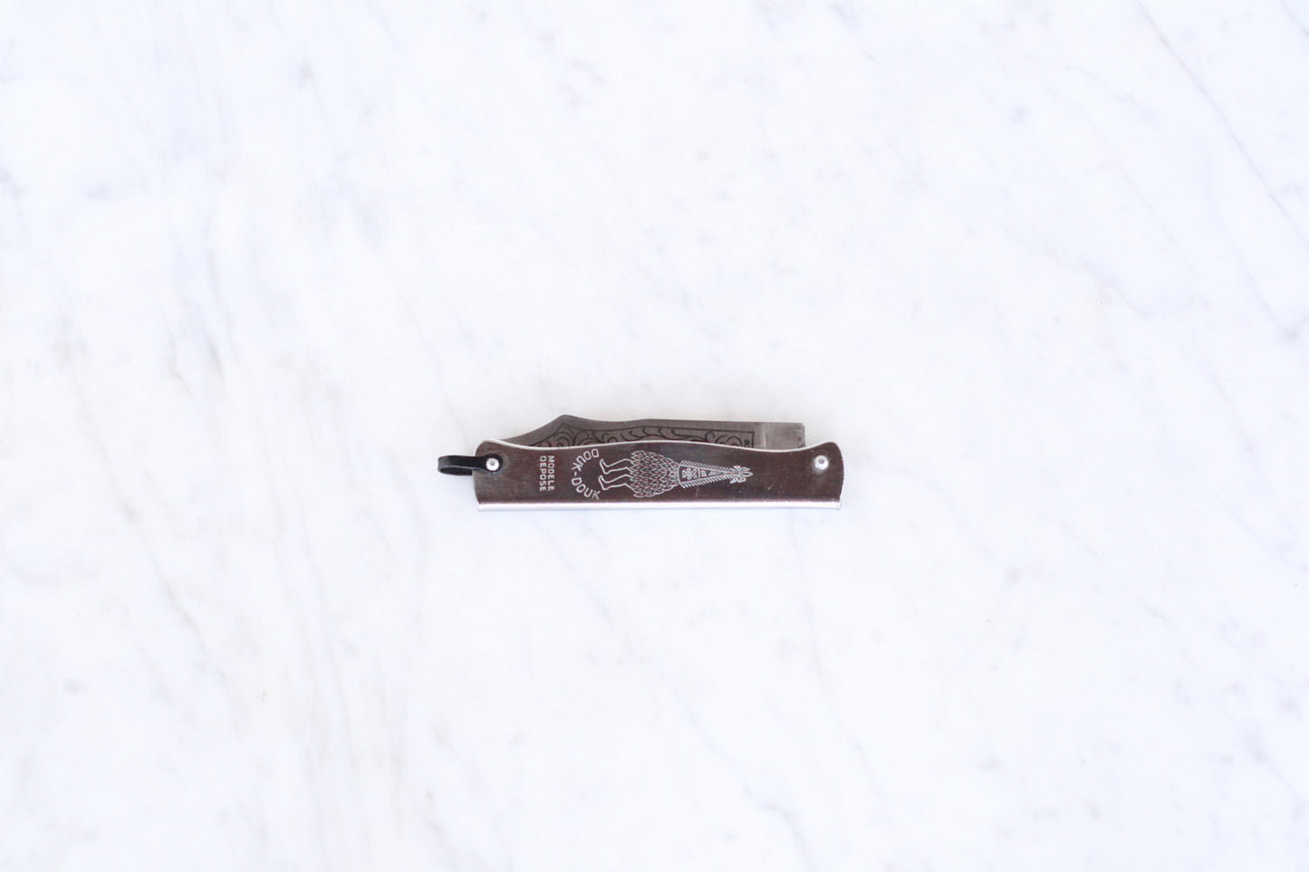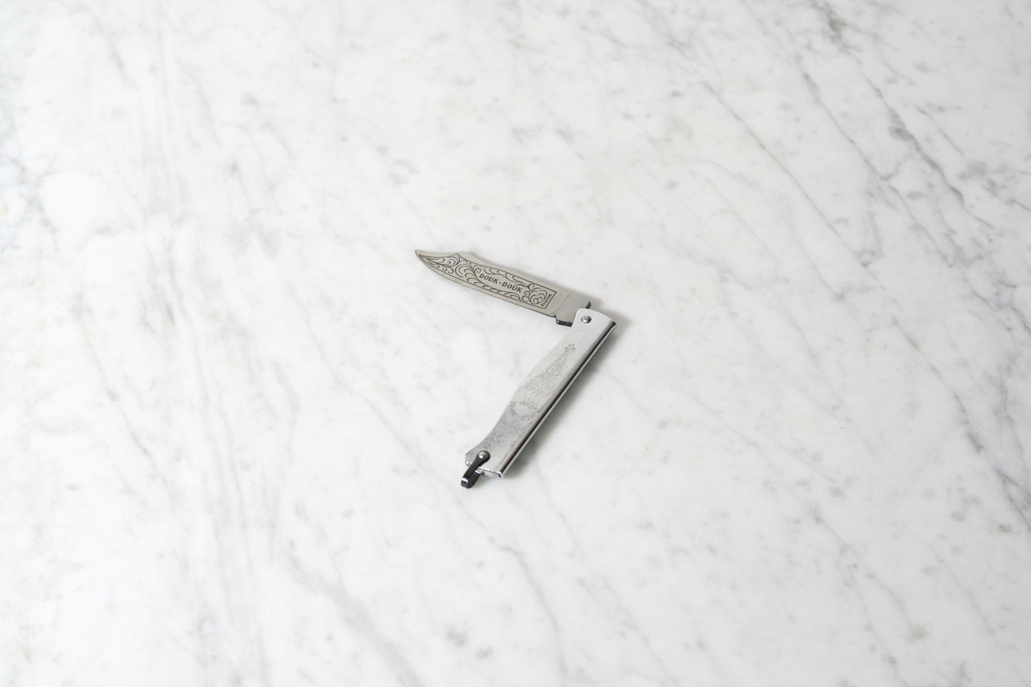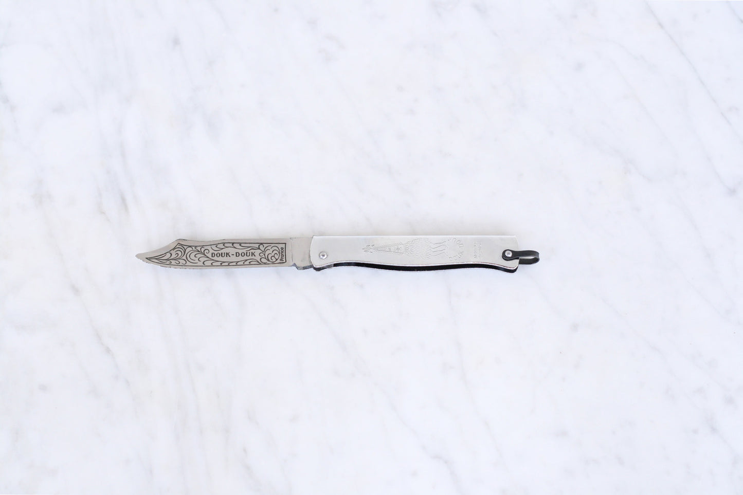 First produced in 1929 by the Cognet family in the French knifemaking city of Thiers. Originally intended for sale in France's South Pacific colonies, the Douk Douk's folded steel handle features an depiction of the Malensian spirit-god of doom. With its lightweight feel, slender profile and razor sharp scimitar blade, the Douk Douk found exceptional popularity in North Africa, and is associated with the Algerian uprising and the National Liberation Front.